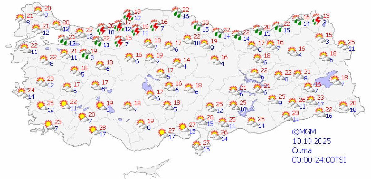 Bugün Karadeniz Bölgesi’nin tamamında yağış görüleceği bilgisini veren Macit, “Cumartesi de Marmara’nın doğusu, Karadeniz, İç Anadolu’nun kuzeyinde yer yer sağanak görülmesini bekliyoruz.” dedi.
