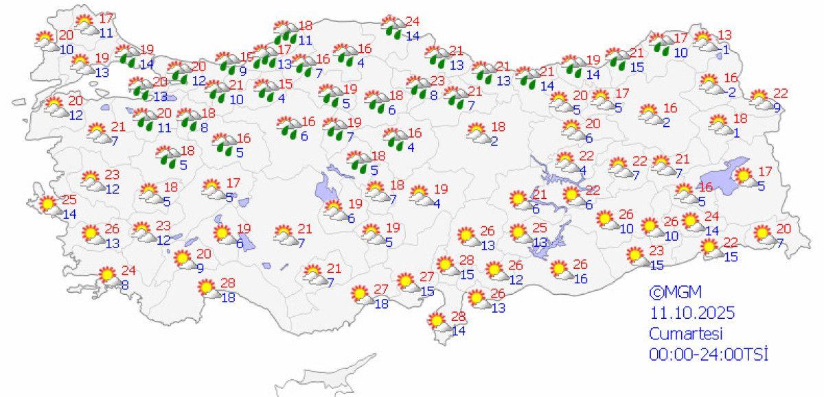 Yayınlana rapora nazaran cumartesi günü yurdun genelinde yağış, pazar ise daha güneşli bir hava bekleniyor.