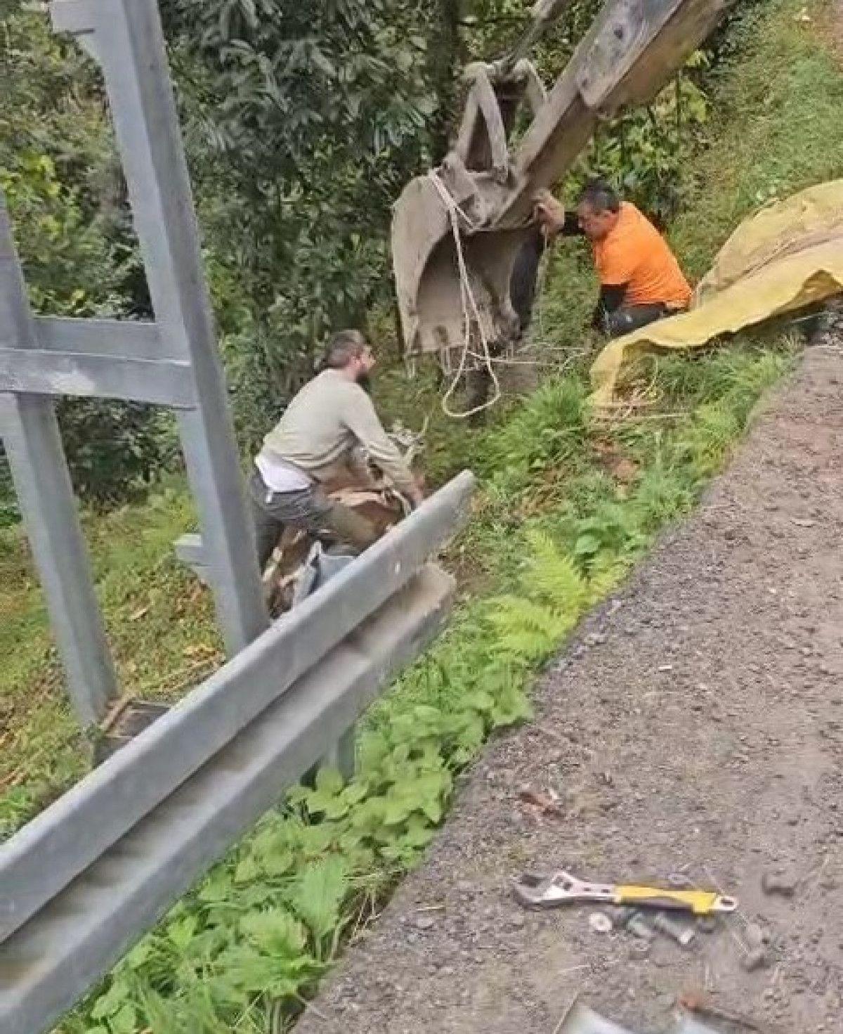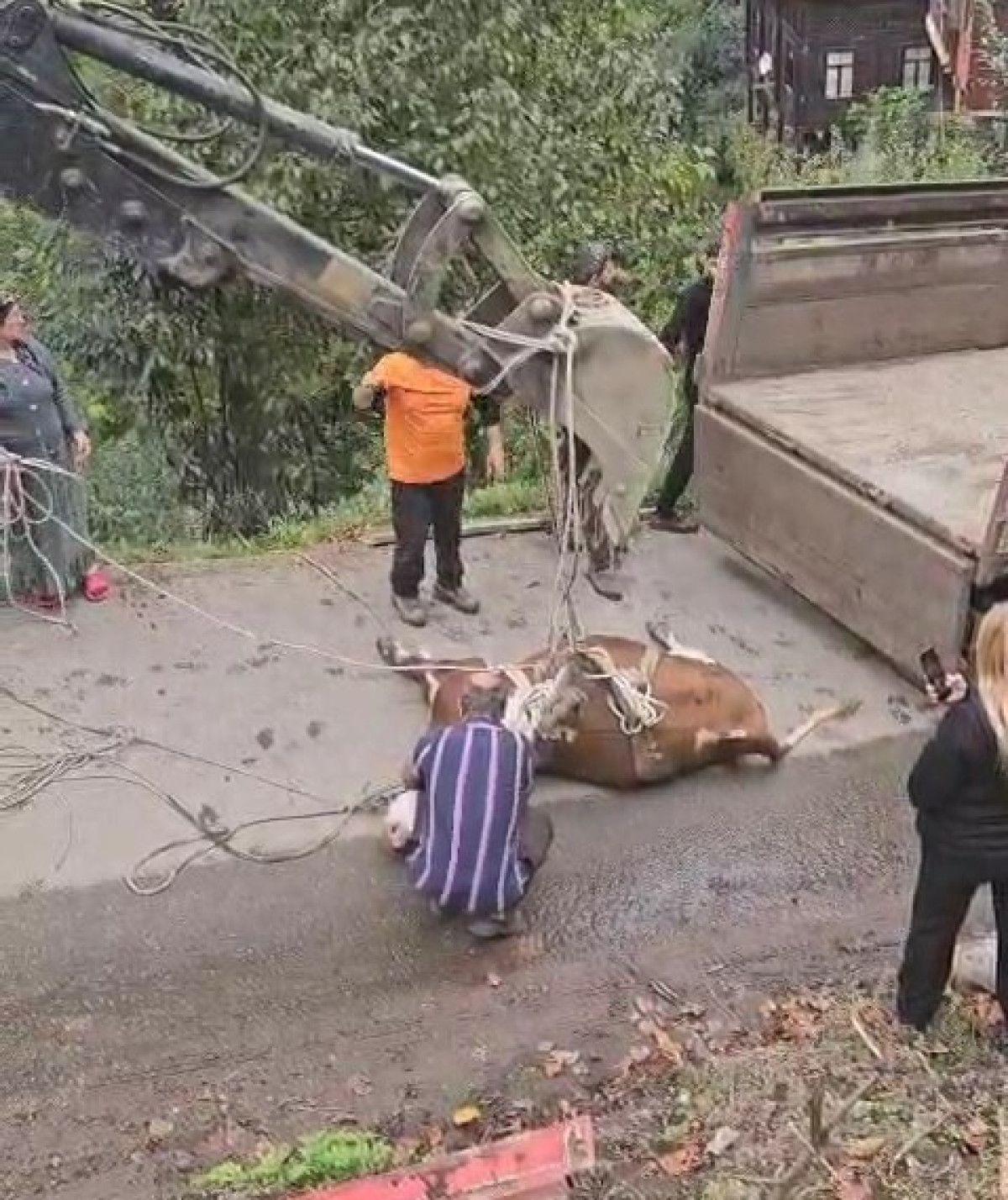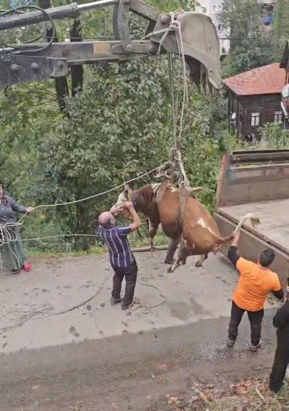 Köydeki vatandaşlar ve Şahin’in koordineli müdahalesiyle inek, vinç yardımıyla kısa müddette bulunduğu yerden çıkarıldı.