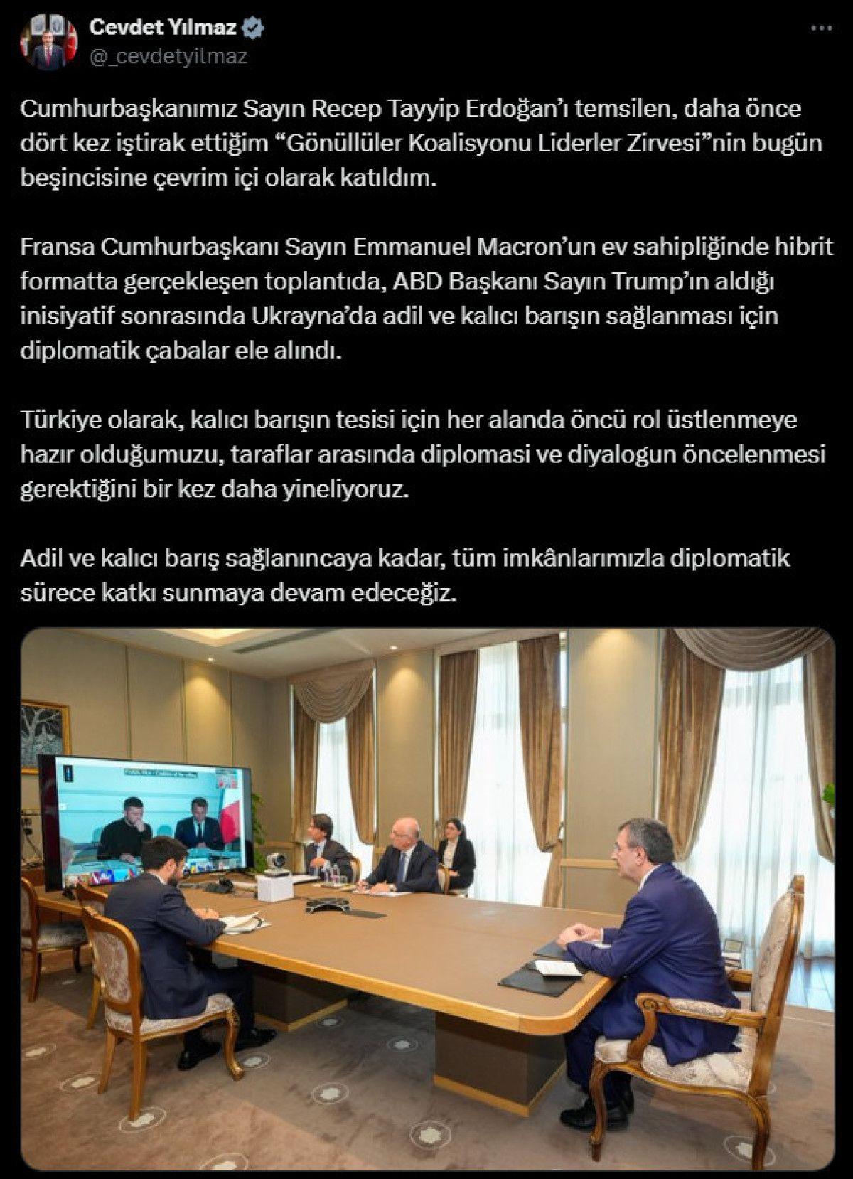 Fransa Cumhurbaşkanı Sayın Emmanuel Macron’un ev sahipliğinde hibrit formatta gerçekleşen toplantıda, ABD Lideri Sayın Trump’ın aldığı inisiyatif sonrasında Ukrayna’da adil ve kalıcı barışın sağlanması için diplomatik uğraşlar ele alındı.